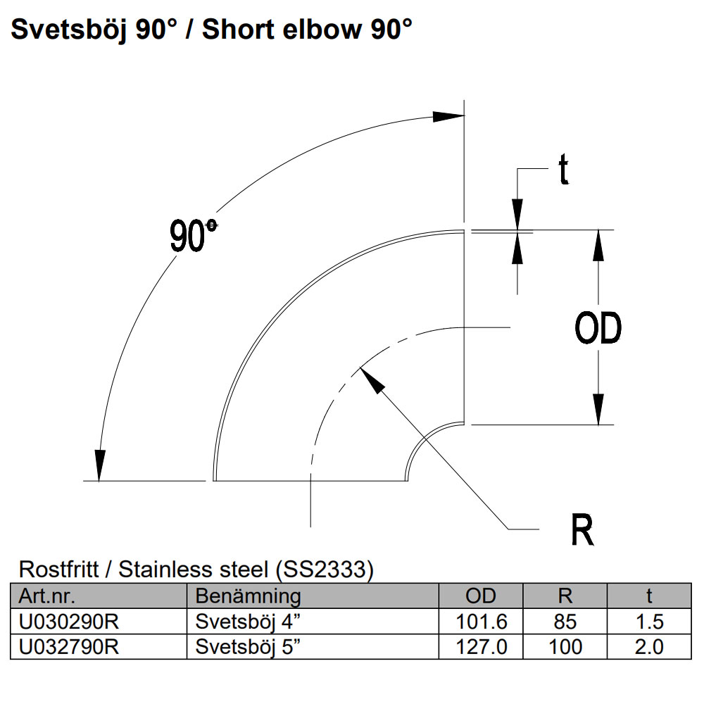 Stainless weld bend 4" 90 ° Center radius = 85 mm Common to use these to the first part of the downpipe when it is tight.