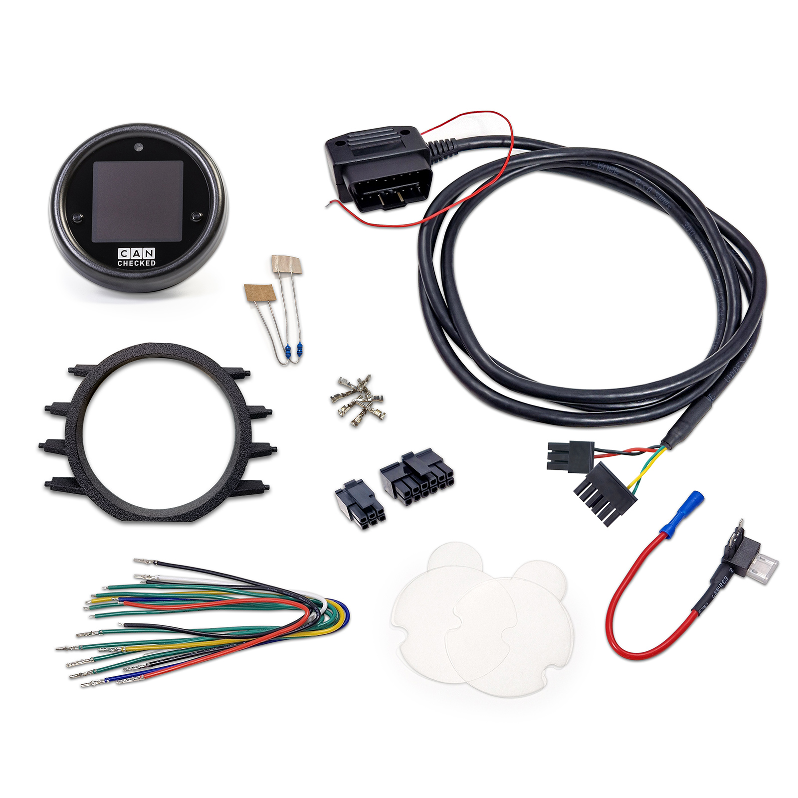 - Different coloured pre-assembled connection cables (length: 20 cm, intended use: power supply, Can Bus, analogue inputs, 5V, sensor ground)