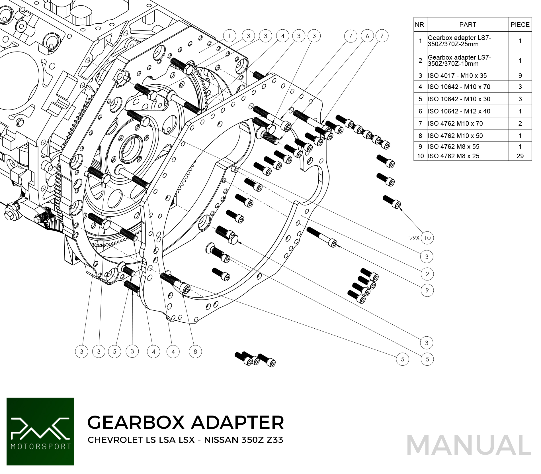 PMC Motorsport adapter kit GM Chevrolet V8 LS - Nissan 350Z Z33 /Nissan 370Z Z34 - 184mm / 7.