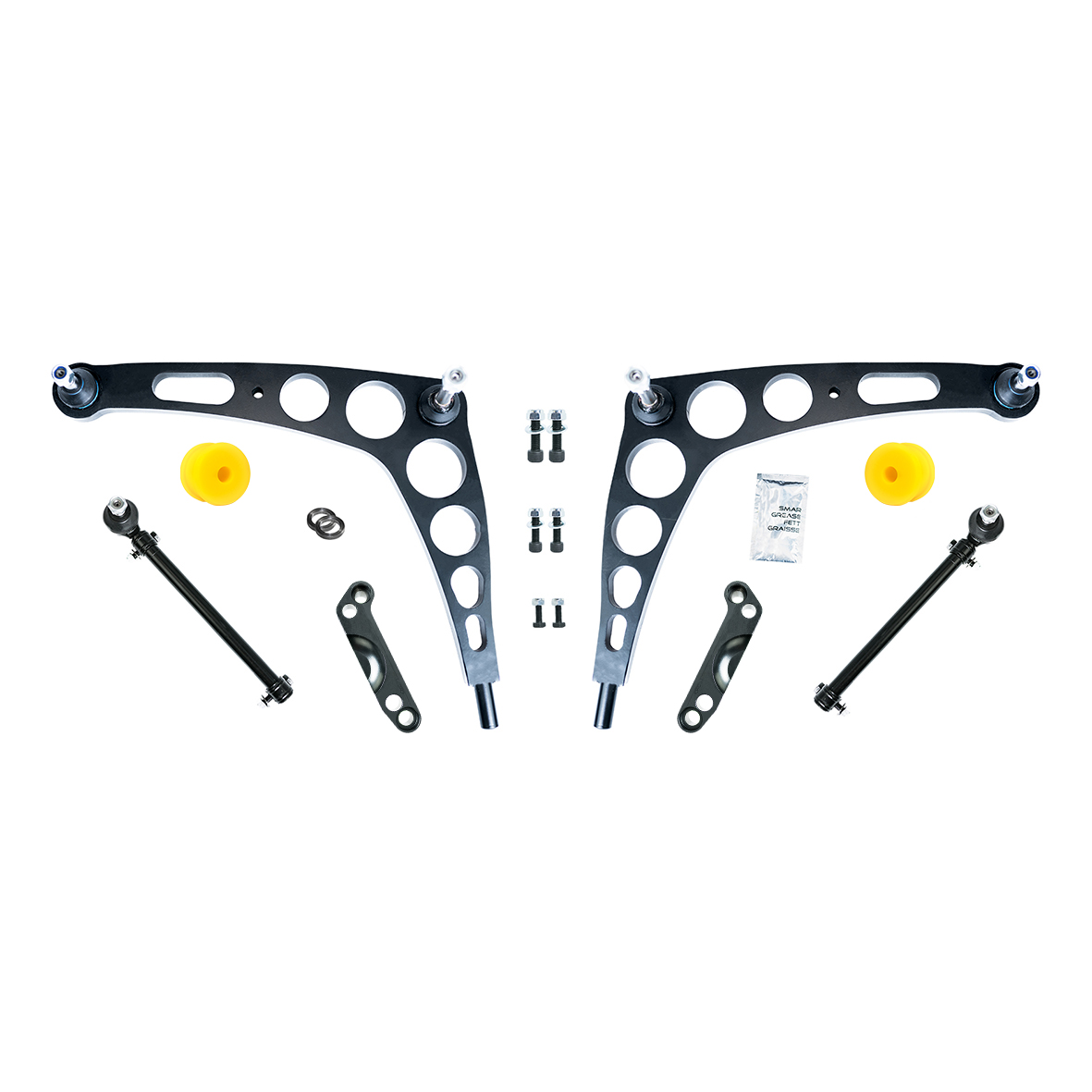 For E30 (4 × 100) the adapters are made of structural steel. The control arm is cut with a laser and has precisely machined holes for pins and stabilizer mounting (we recommend its assembly for better driving of the car while sliding, especially when the suspension is tuned very hard).