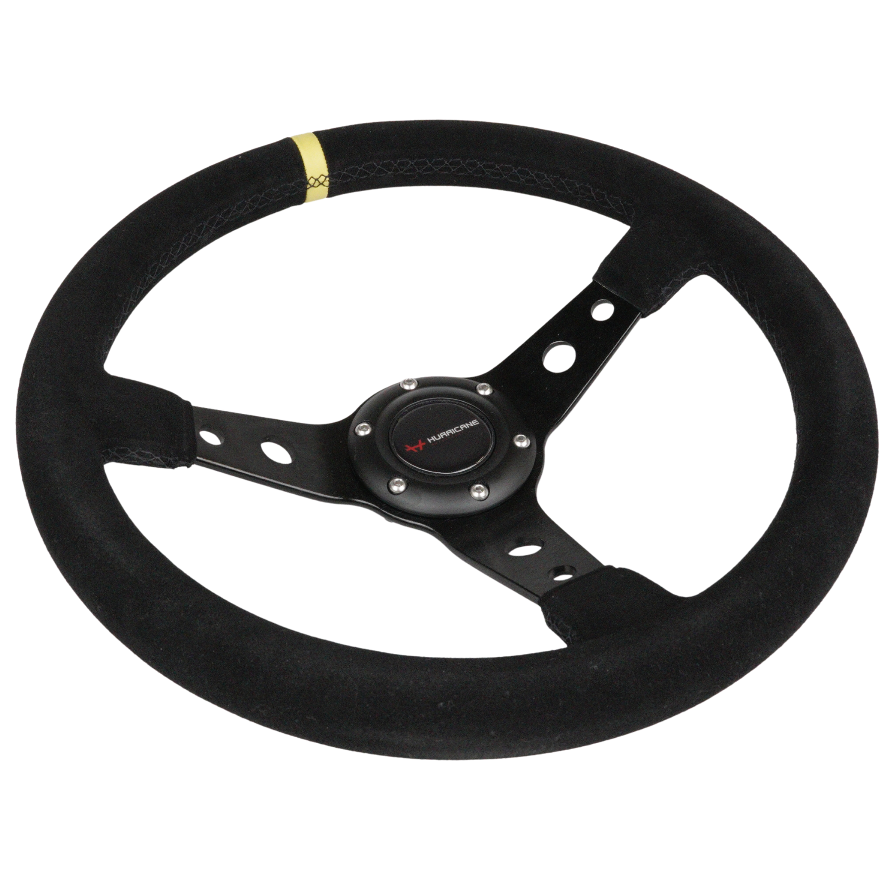 This 3-spoke steering wheel from Hurricane features a suede grip, complete with center ring and horn button. It has an oval suede grip (33/29 mm) and a yellow top marker for quick visual reference during driving.
