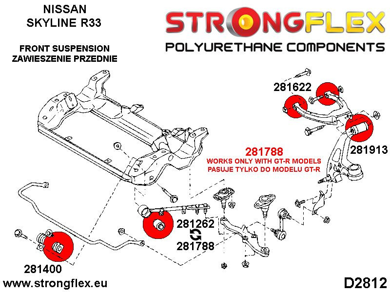 Product ID: 281262B Name: Front lower radius arm to chassis bush Fit: Nissan 200SX S13 88-93 Nissan 200SX S14 94-99 Nissan 200SX S15 99-02 Nissan 300ZX Z32 90-96 Nissan Skyline R32 89-94 Nissan Skyline R33 93-98 Nissan Skyline R34 97-02 Pcs/prod: 1 Required/car: 2 NOTE! Not work with Skyline GTR model.